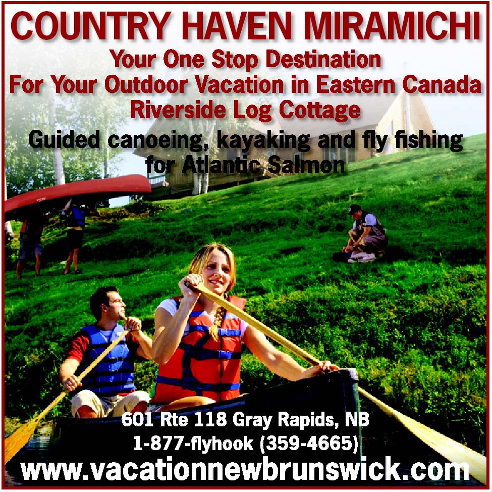 ![]() 2024 Day Adventures and Getaways: Country Haven Miramichi is a Licensed 4 Star fully-fledged Outfitter and is one of the Premier locations on the Miramichi for Atlantic Salmon Fly Fishing. Due to our being close to the sea and our excellent location on the river, there is ample opportunity for catching salmon throughout all of the fishing season. This has helped in making our fishing day adventures so successful for so many years. 2024 will be our 25th anniversary of offering these special day fishing packages in conjunction with New Brunswick Tourism, making Country Haven the longest running Day Adventure provider in the Province. Canoeing & Kayaking Packages